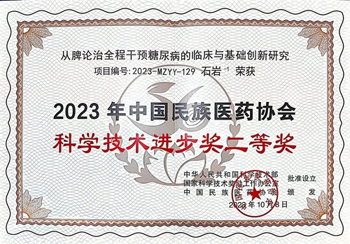 10月21日,“2023年中國民族醫(yī)藥協(xié)會科學技術(shù)獎頒獎大會暨院士、國醫(yī)大師學術(shù)交流大會”在北京召開,我校岐黃學者石巖教授團隊的研究成果“從脾論治全程干預糖尿病的臨床與基礎(chǔ)創(chuàng)新研究”榮獲2023年中國民族醫(yī)藥協(xié)會科學技術(shù)進步二等獎。