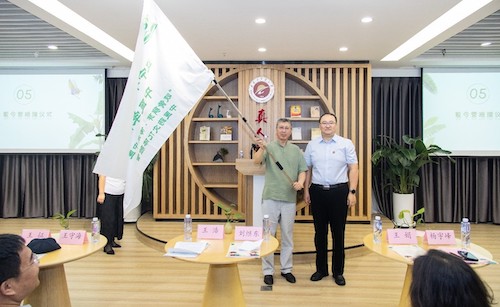 隨后,劉繼東為王征授“岐黃萌芽 傳承中醫(yī)”中醫(yī)藥文化體驗(yàn)營(yíng)營(yíng)旗。