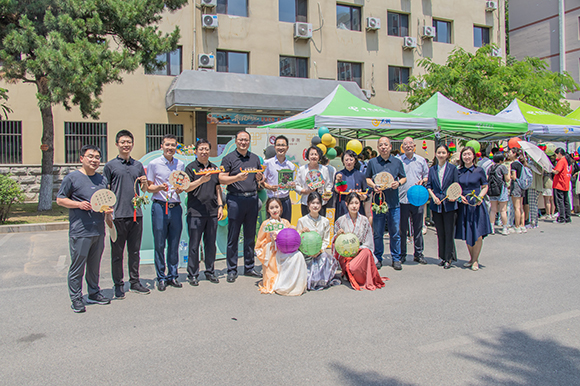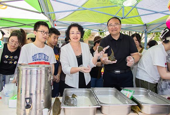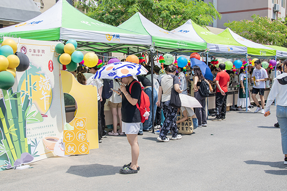 本次活動(dòng)設(shè)置了端午“粽”動(dòng)員、“乾坤一擲”投壺大賽、端午知識(shí)問(wèn)答、手繪扇面、DIY龍舟拼圖、夏日冰飲季、古箏表演和制作艾草花環(huán)等項(xiàng)目,活動(dòng)現(xiàn)場(chǎng)氣氛熱烈,約有上千名同學(xué)參與其中,炎炎夏日也擋不住同學(xué)們的參與熱情。每一個(gè)項(xiàng)目都有同學(xué)在有序排隊(duì)參與,現(xiàn)場(chǎng)還有身著學(xué)位服的畢業(yè)生同學(xué)打卡留念,留下對(duì)母校的深深祝福,記錄美好的校園回憶;食堂主廚現(xiàn)場(chǎng)指導(dǎo),洗好的糯米、泡好的粽葉和各種餡料已準(zhǔn)備齊全,白米粽、蜜棗粽、蛋黃粽、肉粽等各色各樣的粽子讓人大飽口福;現(xiàn)場(chǎng)同學(xué)一起編織五彩繩,用自己獨(dú)特的編結(jié)技法,編織出一系列精美的作品;學(xué)院老師現(xiàn)場(chǎng)手繪團(tuán)扇,將可愛(ài)的圖案與美好的祝福繪于扇面之上,送給幸運(yùn)的同學(xué)。學(xué)校領(lǐng)導(dǎo)與現(xiàn)場(chǎng)同學(xué)一起包粽子、品涼茶、編五彩繩、拼龍舟拼圖、制作艾草花環(huán),大家其樂(lè)融融,共同感受傳統(tǒng)節(jié)日氛圍。學(xué)院還為參與活動(dòng)的同學(xué)準(zhǔn)備了粽子、雞蛋、香囊、小葫蘆、五彩繩等端午小禮品,師生共同迎接端午佳節(jié)。