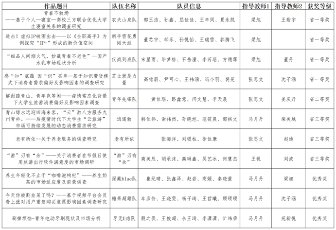 由遼寧省教育廳主辦,東北財(cái)經(jīng)大學(xué)承辦的2023年遼寧省普通高等學(xué)校本科大學(xué)生市場(chǎng)調(diào)查與分析大賽暨“正大杯”第十三屆全國(guó)大學(xué)生市場(chǎng)調(diào)查與分析大賽遼寧賽區(qū)選拔賽已圓滿結(jié)束,我校學(xué)生在本次比賽中累計(jì)獲得遼寧省級(jí)獎(jiǎng)項(xiàng)11項(xiàng),其中包括一等獎(jiǎng)4項(xiàng),二等獎(jiǎng)1項(xiàng),三等獎(jiǎng)3項(xiàng)和優(yōu)秀獎(jiǎng)3項(xiàng),我校6位老師姜慶丹、梁旭、張思文、沈子涵、董丹、王甜宇獲得優(yōu)秀指導(dǎo)教師稱號(hào)。