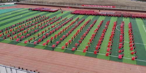 如果信念有顏色,那么一定是中國紅。由300名參訓(xùn)學(xué)生組成的旗海呈現(xiàn)在操場上,伴隨著全場齊唱《強(qiáng)軍戰(zhàn)歌》的歌聲不斷變化陣型,展現(xiàn)了同學(xué)們的激情與活力,傳遞出濃厚的家國情懷。