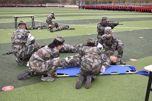 戰(zhàn)地救援演習(xí)由我校教官團(tuán)扮演的中國人民解放軍突擊小隊(duì),在無人機(jī)的預(yù)先偵查后,模擬與敵軍對抗的戰(zhàn)術(shù)背景下,迅速移動至作戰(zhàn)地域,并針對患開放性氣胸等傷員進(jìn)行緊急醫(yī)療救治與轉(zhuǎn)運(yùn)的場景,演示接敵、突入、營救、阻敵、撤離等內(nèi)容。