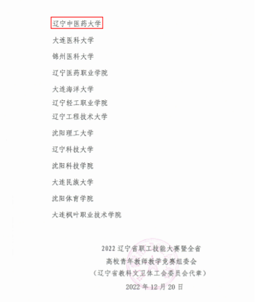 近日,遼寧省總工會、遼寧省人力資源和社會保障廳聯(lián)合舉辦2022年遼寧省職工技能大賽暨全省高校青年教師教學(xué)競賽決賽。我校中西醫(yī)結(jié)合學(xué)院青年教師劉兵榮獲醫(yī)科組第2名,學(xué)校被授予優(yōu)秀組織獎。