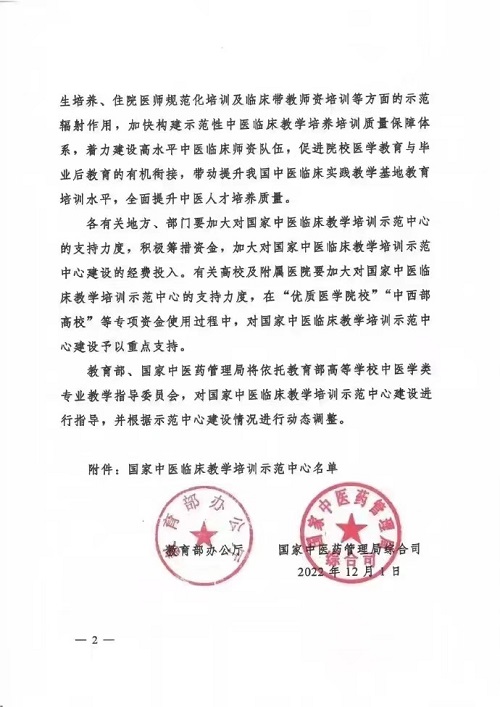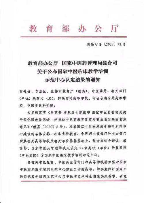 近日,教育部、國家中醫(yī)藥管理局發(fā)布了《關(guān)于公布國家中醫(yī)臨床教學(xué)培訓(xùn)示范中心認(rèn)定結(jié)果的通知》,我校附屬醫(yī)院獲批國家中醫(yī)臨床教學(xué)培訓(xùn)示范中心,本次全國共認(rèn)定33家高校(單位)附屬醫(yī)院。