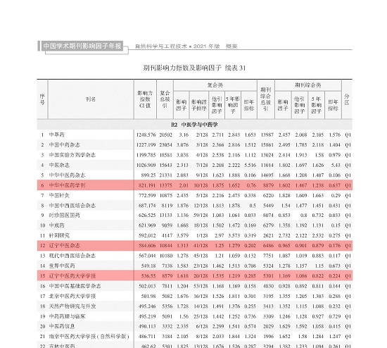 近日,中國科學(xué)文獻(xiàn)計(jì)量評(píng)價(jià)研究中心(中國知網(wǎng))出版的《中國學(xué)術(shù)期刊影響因子年報(bào)(自然科學(xué)與工程技術(shù)·2021版》(簡稱《年報(bào)》)正式發(fā)布。在“R2中醫(yī)學(xué)與中藥學(xué)”類的128種期刊中,我校主辦的三種期刊《中華中醫(yī)藥學(xué)刊》《遼寧中醫(yī)雜志》《遼寧中醫(yī)藥大學(xué)學(xué)報(bào)》名次均靠前,分別排第6名、12名、15名,并再次進(jìn)入Q1區(qū)名單。