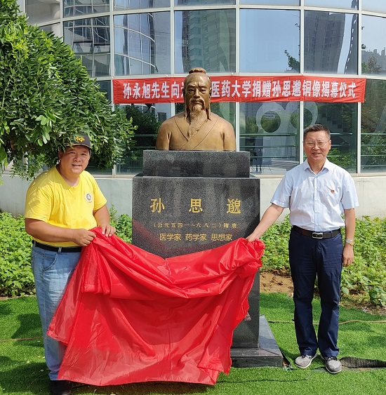 隨后,孫滬生先生和藥學(xué)院院長(zhǎng)謝明為“孫思邈銅像”落成剪彩,全體人員向銅像鞠躬表示敬意。謝明代表學(xué)校向?qū)O永旭先生頒發(fā)了捐贈(zèng)證書(shū)(由孫滬生先生代領(lǐng))。在校學(xué)生代表現(xiàn)場(chǎng)背誦了《千金方》中的部分名方,以此表達(dá)對(duì)孫思邈這位一心為民的“名魁大醫(yī),百代之師”的崇高敬意。