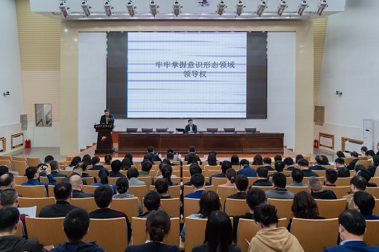 章瑞從意識(shí)形態(tài)的概念、重要性和當(dāng)前意識(shí)形態(tài)領(lǐng)域的熱點(diǎn)問(wèn)題同與會(huì)人員交流了牢牢掌握意識(shí)形態(tài)工作領(lǐng)導(dǎo)權(quán)重大意義。他提到,意識(shí)形態(tài)工作是黨的一項(xiàng)極端重要的工作,做好意識(shí)形態(tài)工作,事關(guān)黨的前途命運(yùn),事關(guān)國(guó)家長(zhǎng)治久安,事關(guān)民族凝聚力和向心力。我們要高舉中國(guó)特色社會(huì)主義的大旗,旗幟鮮明、理直氣壯、針?shù)h相對(duì)、大張旗鼓地與錯(cuò)誤思潮錯(cuò)誤言論作斗爭(zhēng),提高政治站位,認(rèn)真履職盡責(zé),全力做好意識(shí)形態(tài)領(lǐng)域工作。領(lǐng)導(dǎo)干部要保持清醒頭腦,對(duì)風(fēng)險(xiǎn)隱患要有基本的判斷,要有堅(jiān)定的態(tài)度,一旦發(fā)現(xiàn)迅速果斷糾正和處置,絕不留絲毫的傳播空間。要用社會(huì)主義核心價(jià)值觀引領(lǐng)思潮、凝聚共識(shí),讓主流價(jià)值導(dǎo)向成為每一位師生員工的自覺(jué)行動(dòng)。