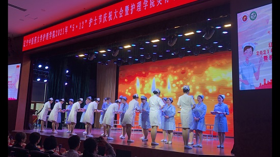 大會以舞蹈《芳華》拉開帷幕。會上,護理學(xué)院黨總支書記張寧蘇致辭,代表護理學(xué)院全體師生對領(lǐng)導(dǎo)和嘉賓的蒞臨表示熱烈歡迎,總結(jié)了近年來護理學(xué)院全體師生取得的成績,闡釋了成立美育中心的目的和意義,對學(xué)院發(fā)展辛勤付出的各位老師、致力于護理事業(yè)的護理學(xué)子表達了節(jié)日祝賀。在表彰環(huán)節(jié),沈陽中心血站黨委書記欒燕為護理學(xué)院授予了“沈陽市無償獻血優(yōu)秀組織獎”。沈陽市皇姑區(qū)團區(qū)委戰(zhàn)線部負責人李想為護理學(xué)院皇姑青年突擊隊頒發(fā)“皇姑區(qū)青年五四獎狀”。護理學(xué)院副院長王妍宣布2021年度“護理學(xué)院優(yōu)秀校友”名單并聘任她們擔任“護理學(xué)院就業(yè)大使”的決定。學(xué)校教學(xué)督導(dǎo)副組長田靜、招生就業(yè)處處長陳冰為優(yōu)秀校友代表頒發(fā)證書。之后進行了莊嚴的授帽儀式,授帽嘉賓由護理學(xué)院領(lǐng)導(dǎo)、教師和學(xué)校各附屬醫(yī)院護理部主任代表、抗擊新冠疫情英雄護理部科護士長代表組成,授帽儀式后全體學(xué)生進行《南丁格爾誓言》宣誓。