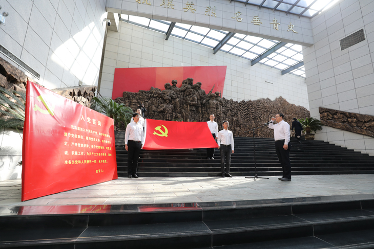 在陳列館一樓正廳,4名黨員代表向抗聯(lián)英雄雕塑敬獻了花籃,黨委書記曾慶捷、校長石巖為花籃整理緞帶,全體黨員領導干部集體向抗聯(lián)英烈三鞠躬,并在黨旗下進行了莊嚴的“重溫入黨誓詞”活動。