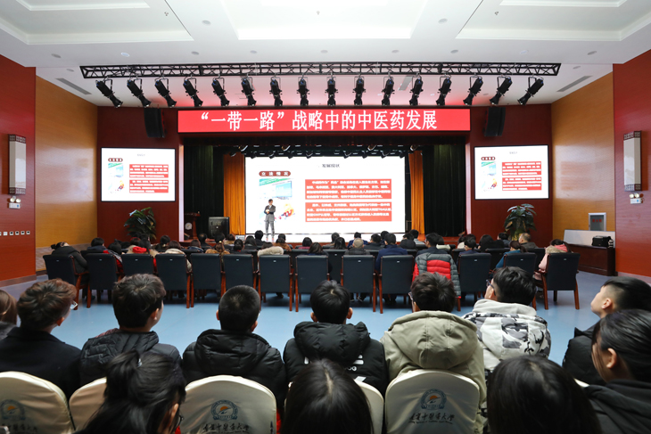 12月5日,校長石巖為學生上“形勢與政策”課,系統(tǒng)地為學生講解了“一帶一路”倡議中的中醫(yī)藥發(fā)展。宣傳統(tǒng)戰(zhàn)部部長周健、團委書記李睿、研究生學院黨總支書記王飛、學生處副處長劉英佶、信息工程學院副院長劉廣、外國語學院副院長潘海鷗、各學院輔導員以及600名學生代表共同聆聽了一堂意義深遠的“形勢與政策”課。