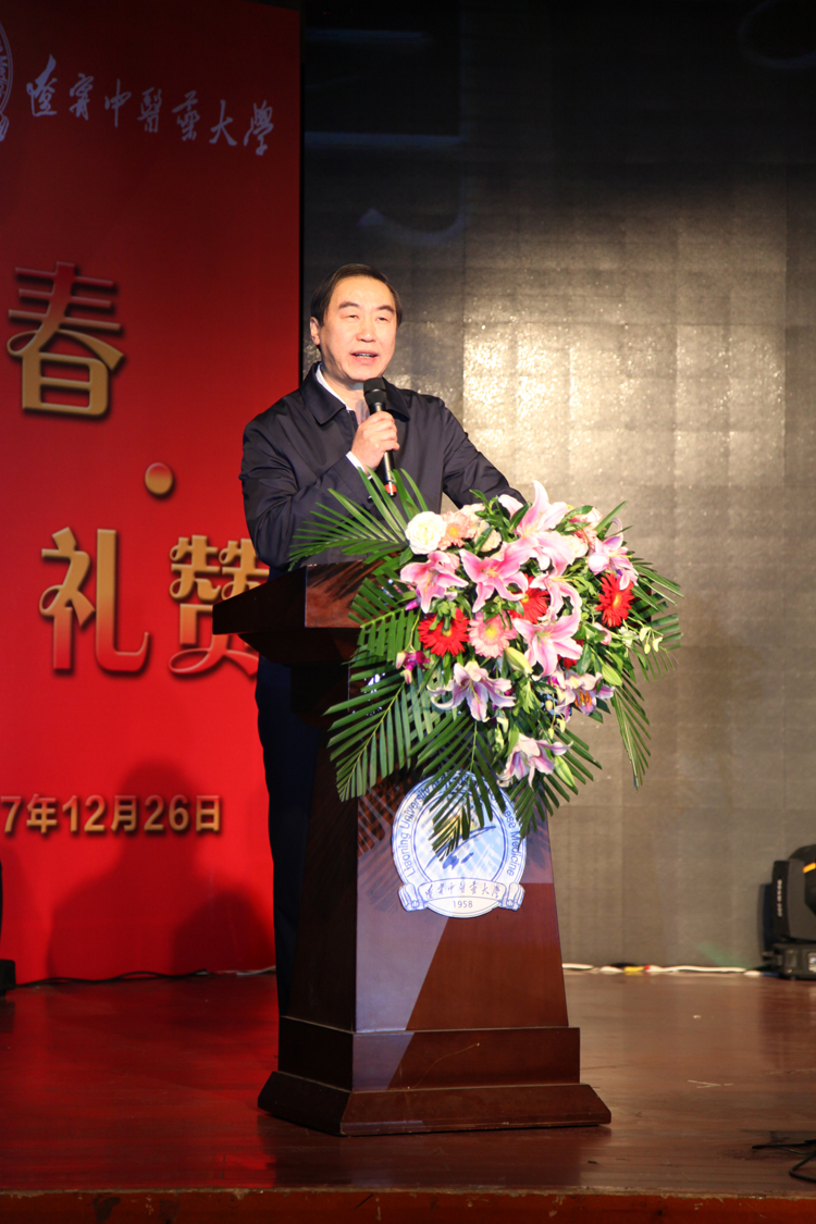 楊關(guān)林講話,對獲獎(jiǎng)同學(xué)表示祝賀,總結(jié)了近年來學(xué)校在各類賽事、人才培養(yǎng)中所取得的優(yōu)異成績,對中醫(yī)學(xué)子提出了三點(diǎn)希望。一是進(jìn)一步學(xué)習(xí)貫徹落實(shí)黨的十九大精神,把社會(huì)主義核心價(jià)值觀內(nèi)化于心,外化于行。做到知行合一、形神合一、體用合一、天人合一。二是深耕祖國傳統(tǒng)文化,多植祖國中醫(yī)藥文化的基因,做到洋為中用,學(xué)貫中西,讓自身的能力得到充分發(fā)揮。三是做德、智、體、美全面發(fā)展的建設(shè)者和接班人,樹立良好的價(jià)值取向,刻苦專研,團(tuán)結(jié)協(xié)作、身強(qiáng)體健、展現(xiàn)個(gè)性。最后他預(yù)祝學(xué)校各項(xiàng)事業(yè)在新的一年取得更加輝煌的成績,全校師生新年快樂。
