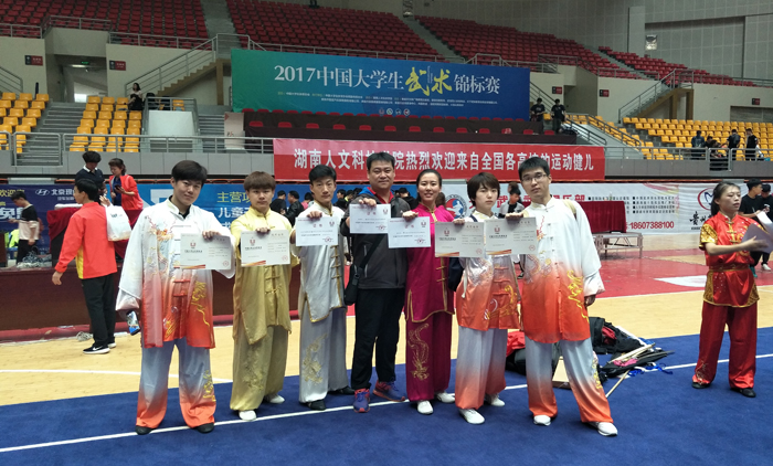 由中國大學(xué)生體育協(xié)會主辦,中國大學(xué)生體育協(xié)會民族傳統(tǒng)體育分會執(zhí)行,湖南人文科技學(xué)院承辦的2017年中國大學(xué)生武術(shù)錦標(biāo)賽于2017年10月2日至8日在湖南省婁底市全民健身服務(wù)中心體育館舉行。來自浙江大學(xué)、復(fù)旦大學(xué)、北京理工大學(xué)、北京體育大學(xué)、同濟(jì)大學(xué)、廈門大學(xué)、澳門大學(xué)、上海中醫(yī)藥大學(xué)、遼寧中醫(yī)藥大學(xué)等全國86所院校的88支武術(shù)隊共672名運動員參加比賽。