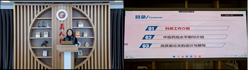 李寧教授以《問道本草--中藥研究新思路與策略》為題,圍繞兩個具有代表性的研究工作,生動地闡釋了課題研究的角度選取與論文撰寫的邏輯思路。其次,李寧教授還推薦了九本中醫(yī)藥高水平期刊,并細(xì)致入微地介紹了每本期刊的收錄范圍、影響因子等關(guān)鍵信息,這對于我校師生選擇合適的發(fā)表平臺,提高論文被接受的可能性具有重要的指導(dǎo)意義。最后,李寧教授通過回顧2023年度中醫(yī)藥領(lǐng)域的十大學(xué)術(shù)進(jìn)展,進(jìn)一步闡述了如何設(shè)計和撰寫高質(zhì)量的學(xué)術(shù)論文,不僅揭示了當(dāng)前中醫(yī)藥學(xué)術(shù)研究的最新動態(tài),也啟發(fā)了大家如何在未來的研究中融入創(chuàng)新元素,設(shè)計出既有深度又有廣度的科研論文。