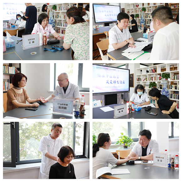 在另一活動現場,附屬醫(yī)院婦產科主任王昕、治未病科主任王莉、呼吸與危重醫(yī)學二科主任趙克明、干診科/老年病醫(yī)學科主任楊鶯、腦病康復三科主任劉峻、傳統(tǒng)療法中心醫(yī)生張宇以及急診中心護士鄧彧共同為老師們進行健康義診。望聞問切,耐心傾聽,細致解答,臨床經驗豐富的專家們?yōu)槔蠋焸冎鹨豢丛\,幫助了百余位教師了解掌握自身的健康狀況。專家們務實的工作態(tài)度和熱情的工作理念,贏得了老師們的一致好評,紛紛表示“足不出校就能享受到優(yōu)質的中醫(yī)藥診療服務真是太贊了”!