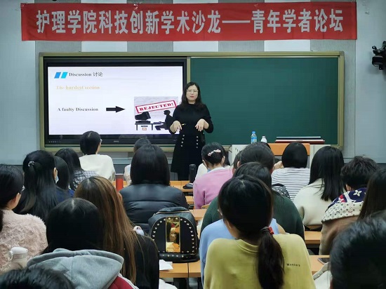 11月25日,護(hù)理學(xué)院科技創(chuàng)新學(xué)術(shù)沙龍“青年學(xué)者論壇”第一次講座在東校區(qū)1002教室拉開帷幕。講座邀請護(hù)理學(xué)博士劉蕾副教授講授《中英文論文寫作》。護(hù)理學(xué)院院長李超、副院長王妍、以及護(hù)理學(xué)院和附屬醫(yī)院的專業(yè)教師、在讀研究生參加了講座。
