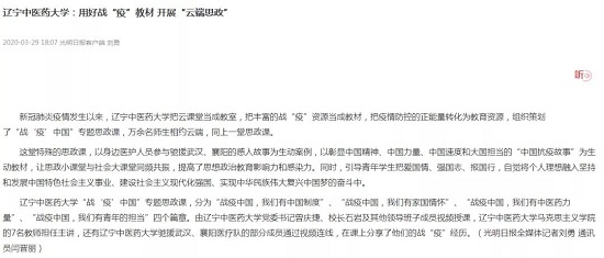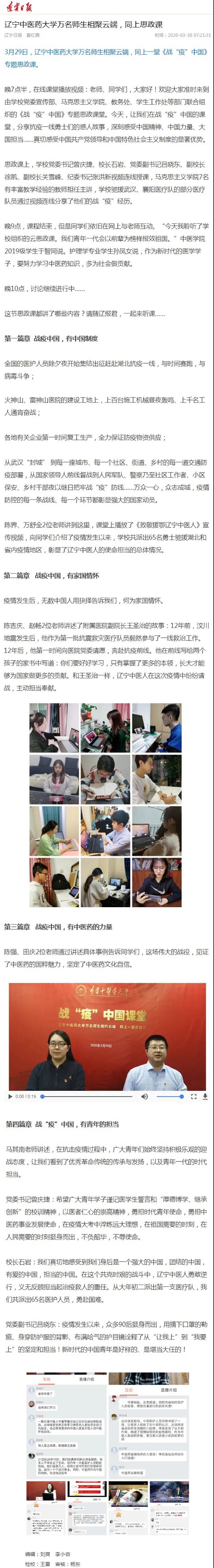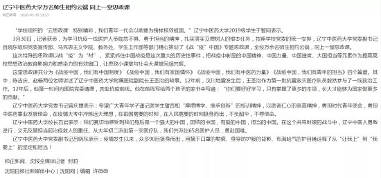 3月29日19:30,全校萬余名師生相約云端,同上一堂思政課。廣大師生積極留言、熱切談論,4.5萬余人點贊。人民網(wǎng)、光明日報、遼寧日報、沈陽日報、中國焦點在線、遼寧大學生在線聯(lián)盟、云盛京、二三里資訊等多家媒體進行了深入采訪報道,對這次網(wǎng)絡思政課給予了高度評價。