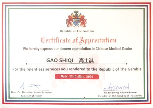 一張印有岡比亞總統(tǒng)阿達(dá)馬?巴羅與衛(wèi)生部部長艾哈邁杜?拉明?薩馬泰親筆簽名的嘉獎(jiǎng)狀,見證著一段跨越萬里的仁心故事。近日,附屬醫(yī)院第22批援岡比亞中國醫(yī)療隊(duì)中醫(yī)專家高士淇,以精湛醫(yī)術(shù)與赤誠情懷,在西非大地書寫了中醫(yī)藥國際化的動(dòng)人篇章。