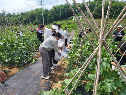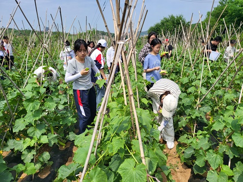 實(shí)踐環(huán)節(jié)中,同學(xué)們熱情高漲,迅速投身采摘工作。他們穿梭在黃瓜架間,撥開層層疊疊的葉片,仔細(xì)尋覓藏在深處的“寶藏”黃瓜。大家互相配合,歡聲笑語回蕩在整個(gè)勞動(dòng)教育基地。