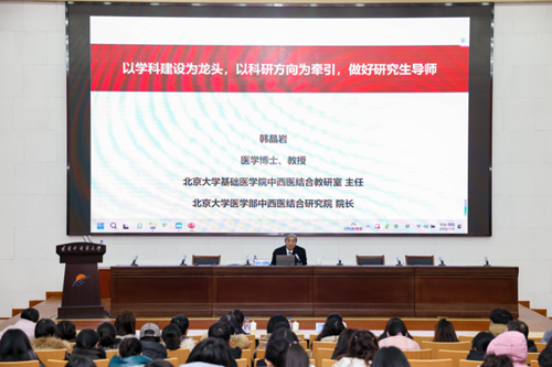 講座中,韓晶巖教授以《以學(xué)科建設(shè)為龍頭,以科研方向?yàn)闋恳?,做好研究生?dǎo)師》為題,分享了研究生導(dǎo)師成長之道。講座伊始,韓教授追溯了北京大學(xué)醫(yī)學(xué)部中西醫(yī)結(jié)合學(xué)科發(fā)展的歷史脈絡(luò),揭示了學(xué)科變遷背后的邏輯與趨勢,為我們理解當(dāng)前學(xué)科生態(tài)提供了寶貴視角。緊接著,他聚焦于研究方向的選擇,強(qiáng)調(diào)應(yīng)以國家重大需求為導(dǎo)向。在構(gòu)建研究平臺與組建高效團(tuán)隊(duì)方面,韓教授分享了寶貴的實(shí)戰(zhàn)經(jīng)驗(yàn)。他指出科學(xué)的管理制度是保障科研活動有序進(jìn)行、激發(fā)團(tuán)隊(duì)活力的關(guān)鍵。最后,韓教授從技、術(shù)、道三個維度為我們指明了自我提升的路徑。