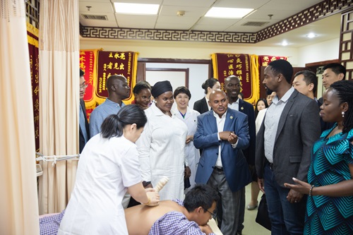 代表團(tuán)一行還參觀了學(xué)校附屬醫(yī)院康復(fù)中心,了解了醫(yī)院的診療特色及中醫(yī)藥現(xiàn)代應(yīng)用情況,并在傳統(tǒng)療法中心親自體驗(yàn)了中醫(yī)傳統(tǒng)特色療法。