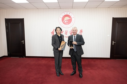 會見中,呂曉東與達(dá)倫·米切爾代表雙方學(xué)?;ベ?zèng)禮品。