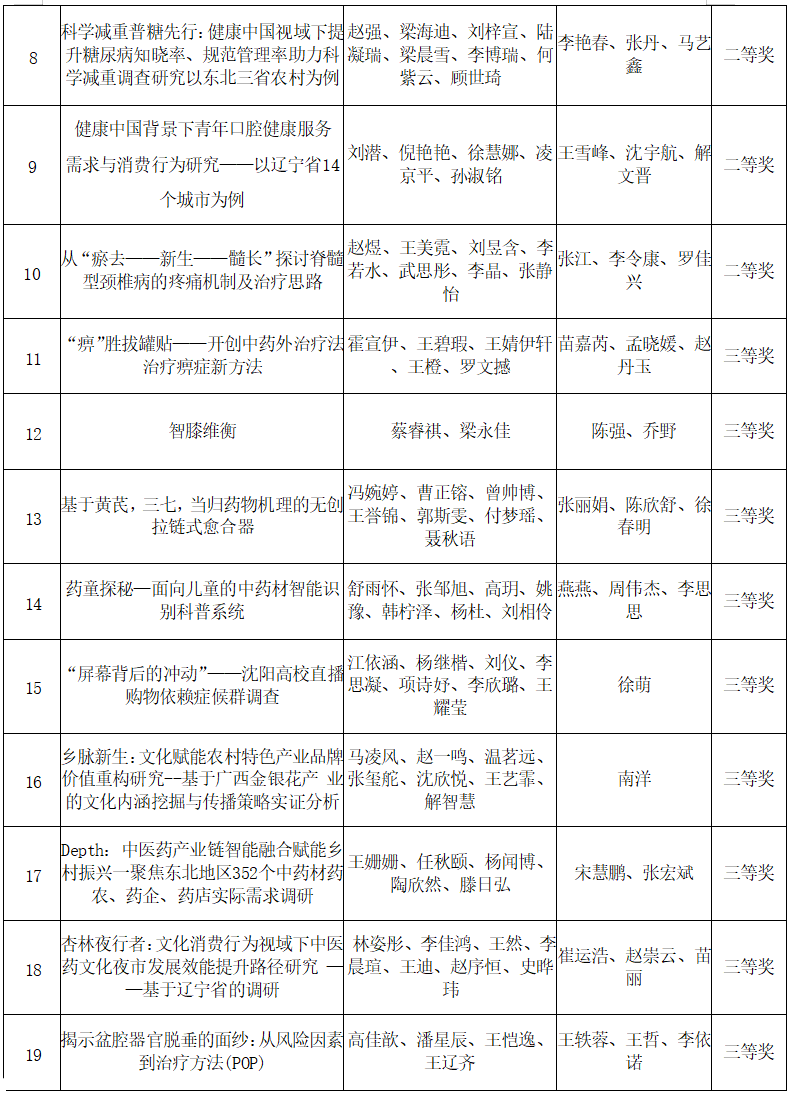 作為聚焦學術前沿、激發(fā)創(chuàng)新活力的省級權威賽事,本屆“挑戰(zhàn)杯”匯聚了全省各高校的優(yōu)秀科創(chuàng)力量。我校精心遴選并推送的20件參賽作品中,有19件作品成功突圍,斬獲省級獎項。我校喜獲特等獎1項、一等獎1項、二等獎8項、三等獎9項,獲獎率高達95%,用實力彰顯了遼中醫(yī)學子在科創(chuàng)領域的扎實功底與拼搏精神。